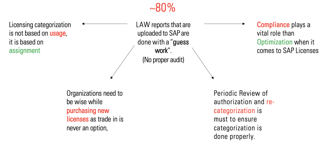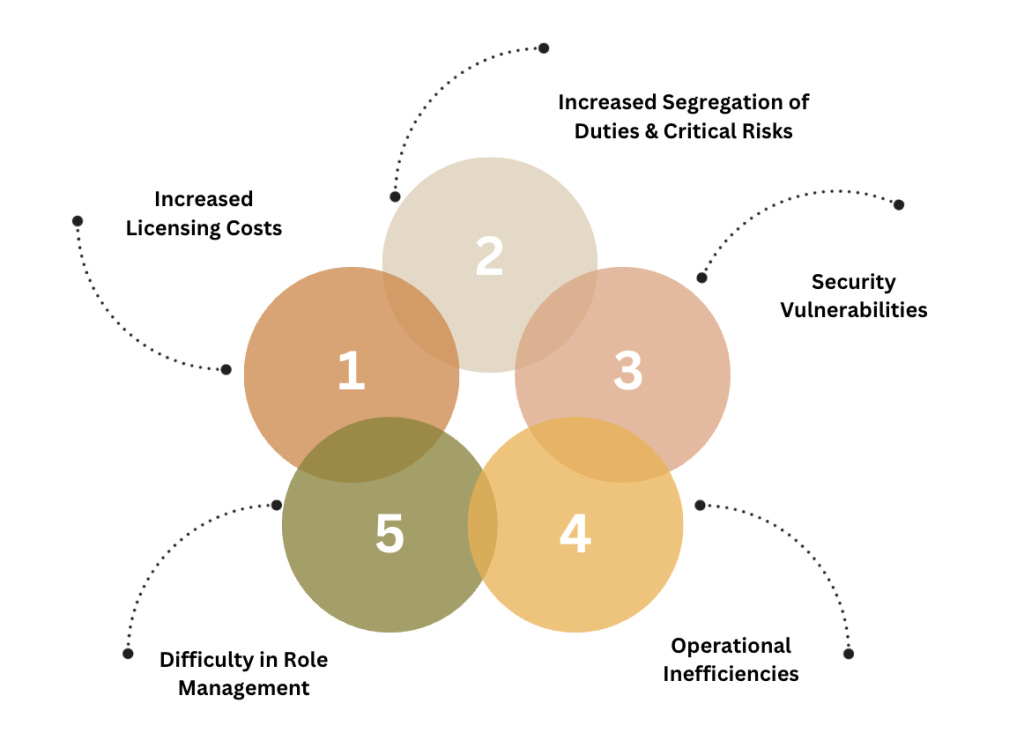 As mentioned, SAP licensing is one of the most significant expenses for enterprises, often inflated due to misaligned authorization design. Contrary to popular belief, licensing costs are not determined by how users utilize the system but by the design of their authorizations. Roles with excessive transaction codes or overly broad permissions often result in users being assigned to higher licensing categories than necessary. SAP role redesign focused on optimizing authorization design is the solution to mitigate these costs while ensuring compliance and system security.